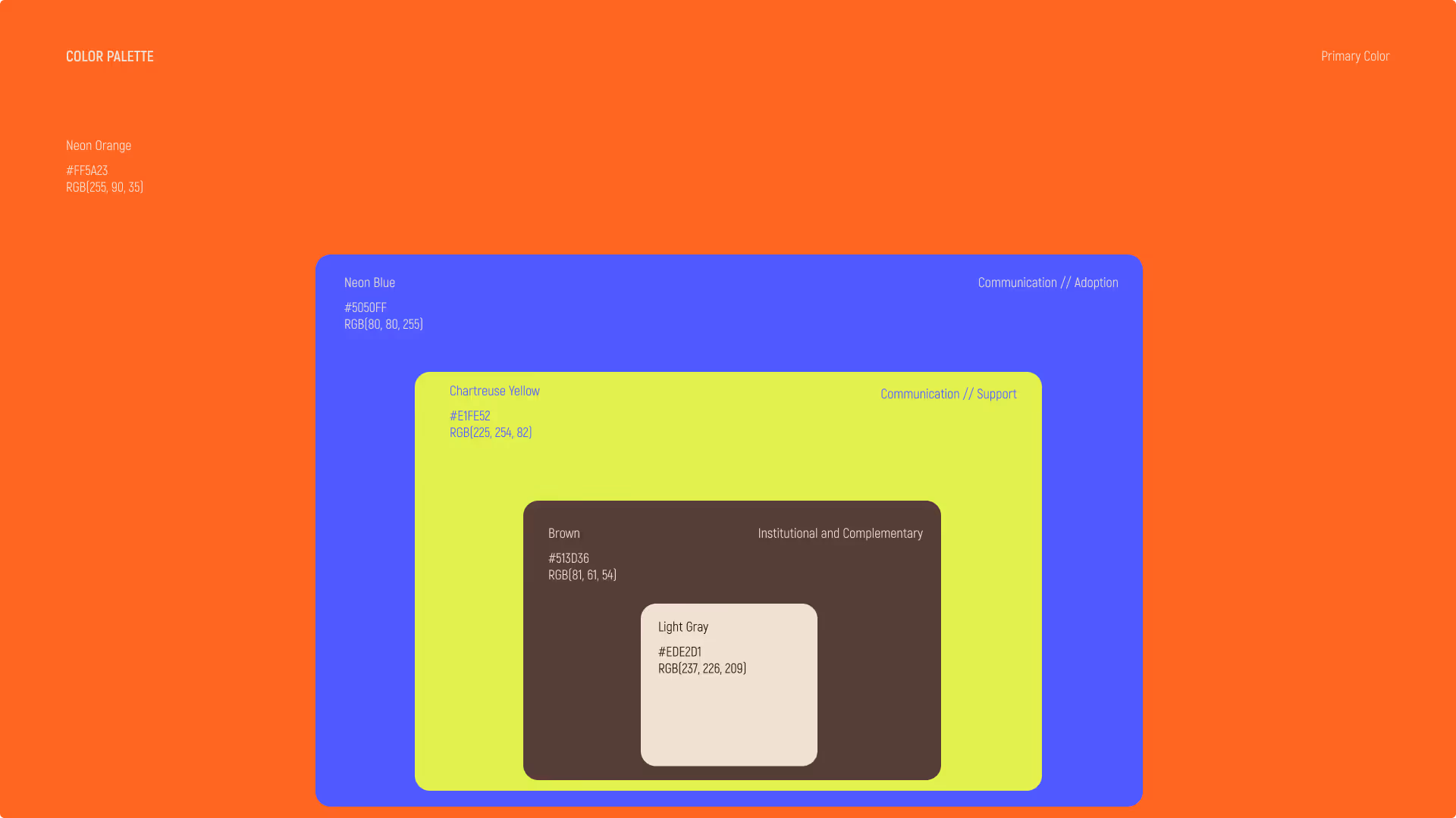 The refreshed color system introduces neon blue for adoption, yellow chartreuse for support, and brown for institutional communications, a triadic palette that ensures clarity, cohesion, and purpose across every touchpoint.